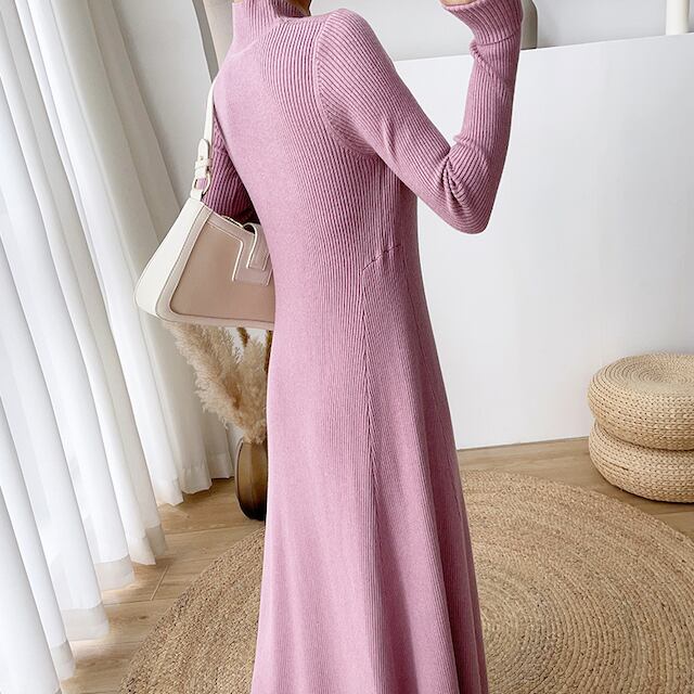 【予約販売】ニットワンピース レディース ロングワンピ 長袖 ハーフタートルネック フレア Aライン おしゃれ かわいい デート 秋冬 シンプル S/M/L/XL ブラック/オフホワイト/ブルーグレー/パープル/ブラウン/ベージュ