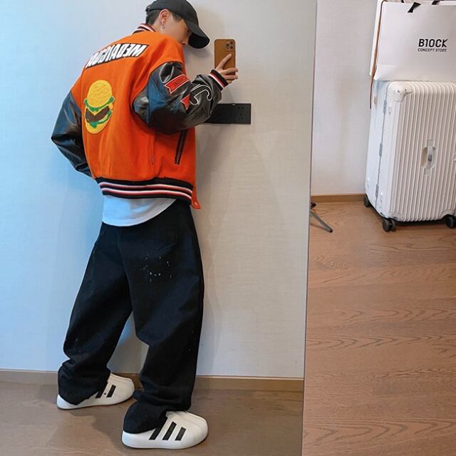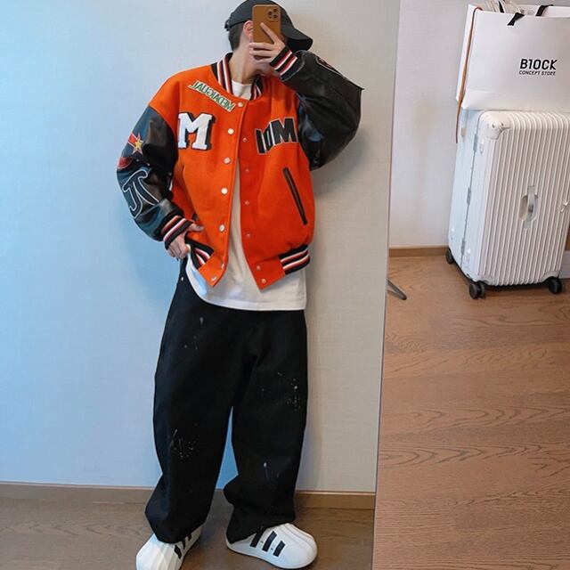 【予約販売】スタジャン ブルゾン アメリカン レザー B系 防寒 メンズ アウター カレッジ風 アメカジ ショート丈 オーバーサイズ ブラック オレンジ お洒落 こなれ感 韓国 ベーシック 秋 冬 大きいサイズ M/L/XL/2XL