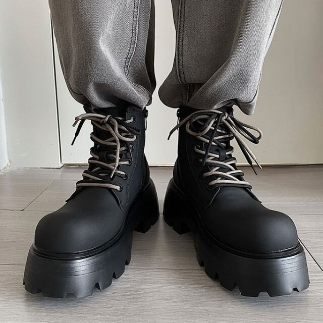 【予約販売】ブーツ メンズ ビッグシルエット ゴツ底 厚底 7cm 靴 ブラック 黒 ハイカット バイカラー紐 お洒落 韓国 トレンド カジュアル 24cm/24.5cm/25cm/25.5cm/26cm/26.5cm/27cm