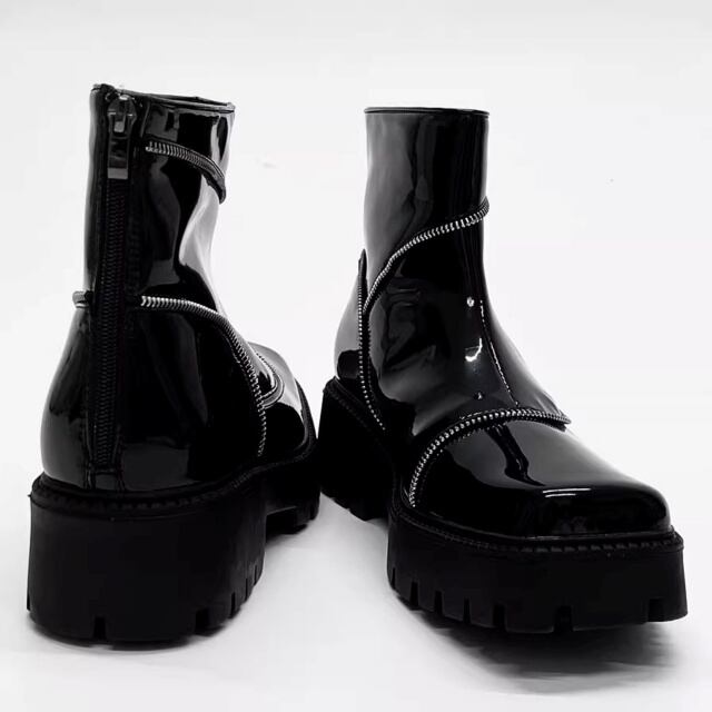 【予約販売】ブーツ レザー メンズ 艶 ジッパー チャック ゴツ底 厚底 靴 ブラック 黒 ハイカット お洒落 韓国 トレンド カジュアル ビンテージ風 24cm/24.5cm/25cm/25.5cm/26cm/26.5cm/27cm