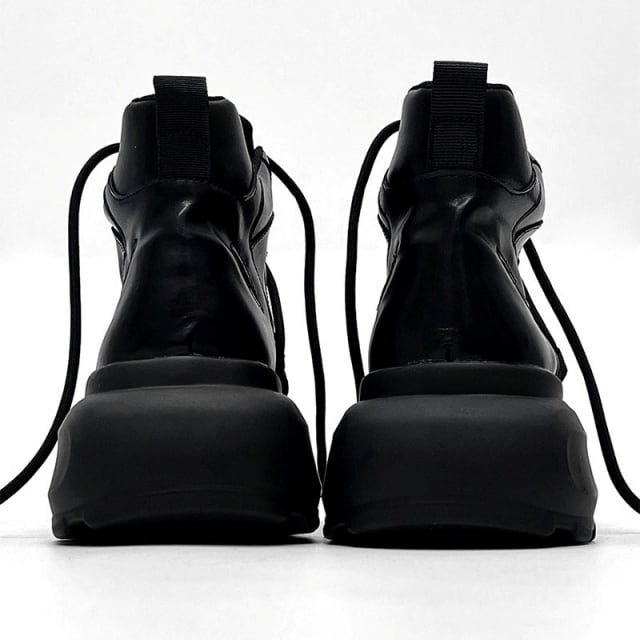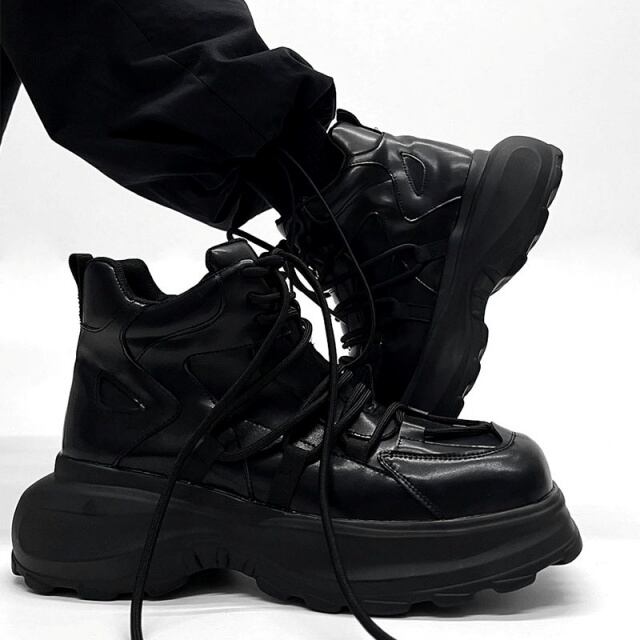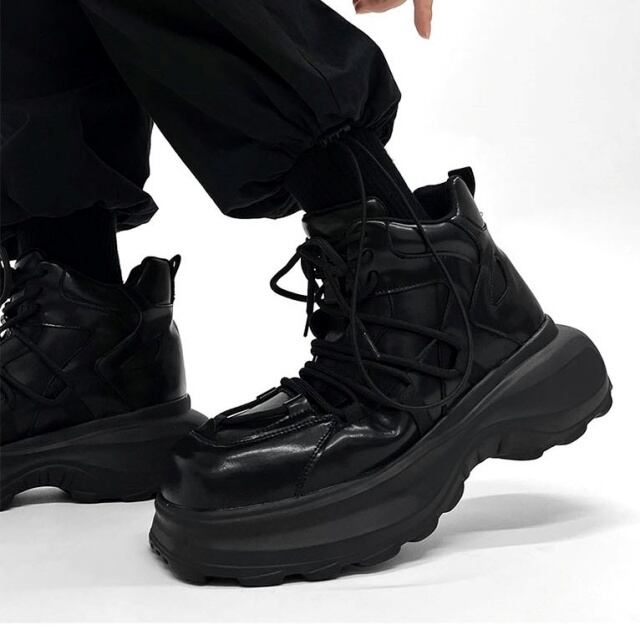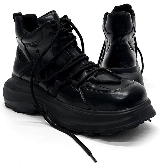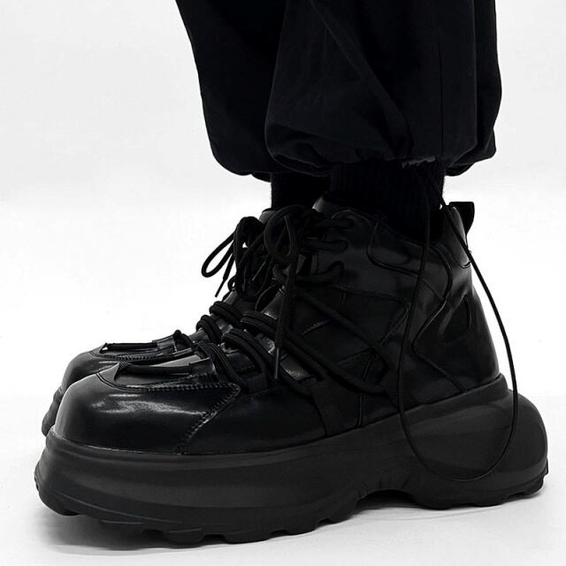 【予約販売】スニーカー レザーシューズ メンズ ビッグシルエット ハイカット ゴツ底 厚底 靴 ブラック 黒 お洒落 韓国 トレンド カジュアル 24cm/24.5cm/25cm/25.5cm/26cm/26.5cm/27cm