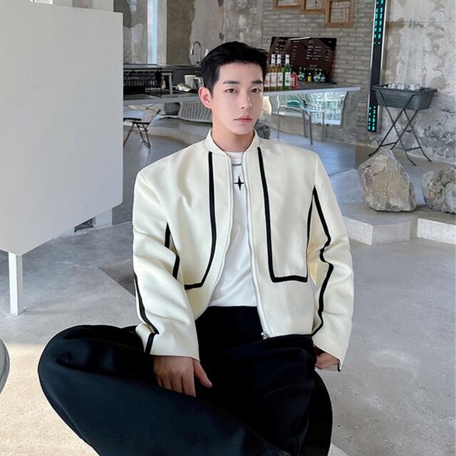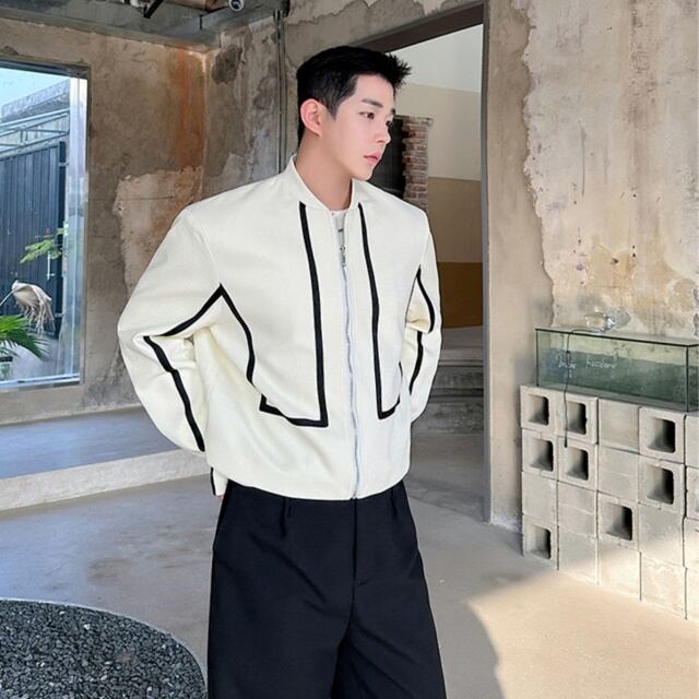 【予約販売】ブルゾン ジャケット 無地 バイカラーライン メンズ ブラック ホワイト ショート丈 ノーカラー ジップアップ こなれ感 お洒落 トレンド 韓国 トレンド M/L/XL