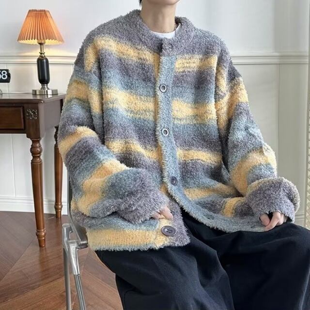 【予約販売】カーディガン ニット セーター グラデーション ボーダー柄 メンズ グレー イエロー オーバーサイズ こなれ感 ストリート お洒落 韓国 トレンド 秋冬 S/M/L/XL/2XL/3XL