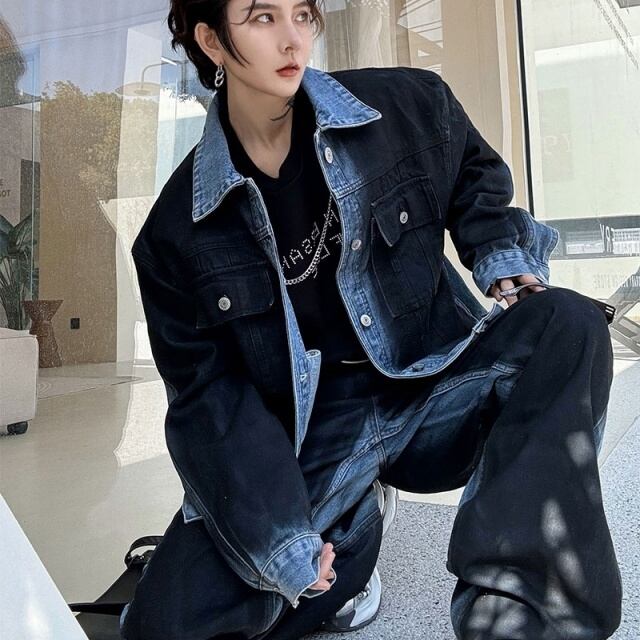 【予約販売】メンズ セットアップ メンズ デニム ジージャン カジュアル 男前 ブラック バイカラー ブルー こなれ感 韓国 ジャケット パンツ セット セットアップ トレンド M/L/XL
