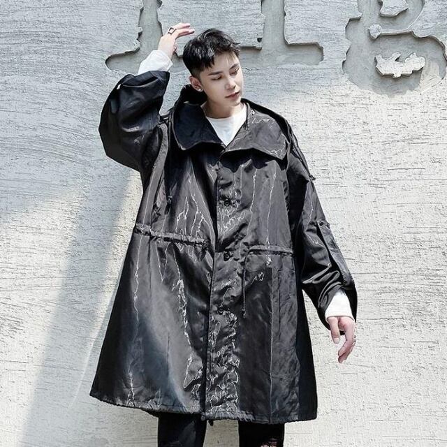 【予約販売】コート メンズ ミドル丈 フード付き 光沢 ビッグシルエット ブルー ブラック コート 韓国 防寒 お洒落 こなれ感 ベーシック 秋 春 M/L/XL