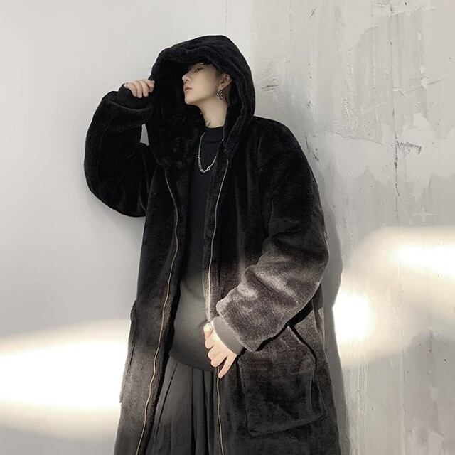 【予約販売】ファーコート フード メンズ ボア ロング丈 もこもこ フード ビッグシルエット ブラック 韓国 防寒 お洒落 こなれ感 ベーシック 秋冬 M/L/XL