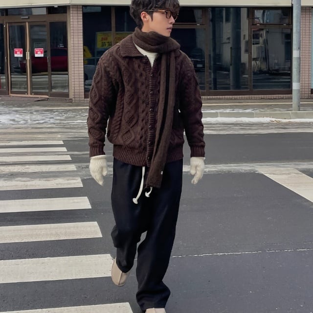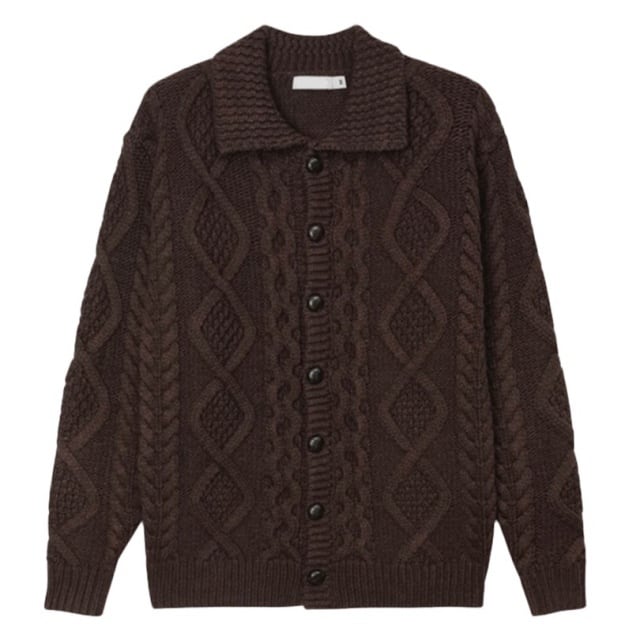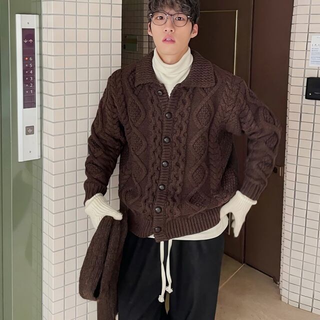 【予約販売】カーディガン リブニット パーカー セーター ケーブル編み ボタン 襟付き メンズ ブラウン 茶色 こなれ感 ストリート お洒落 韓国 トレンド 秋冬 M/L/XL