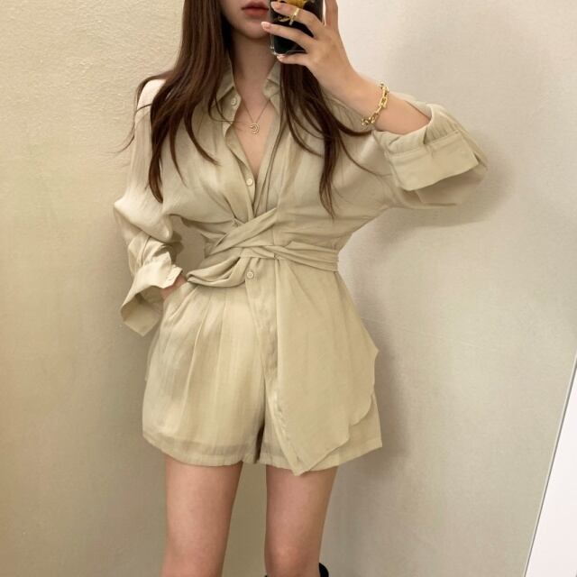 【予約販売】セットアップ シャツ ショートパンツ 長袖 上下 シフォン ウエストマーク レディース 前ボタン ブルー ベージュ ブラック フェミニン 体型カバー こなれ感 大人可愛い シンプル おしゃれ 韓国 旅行 バカンス 春 夏 トレンド フリー