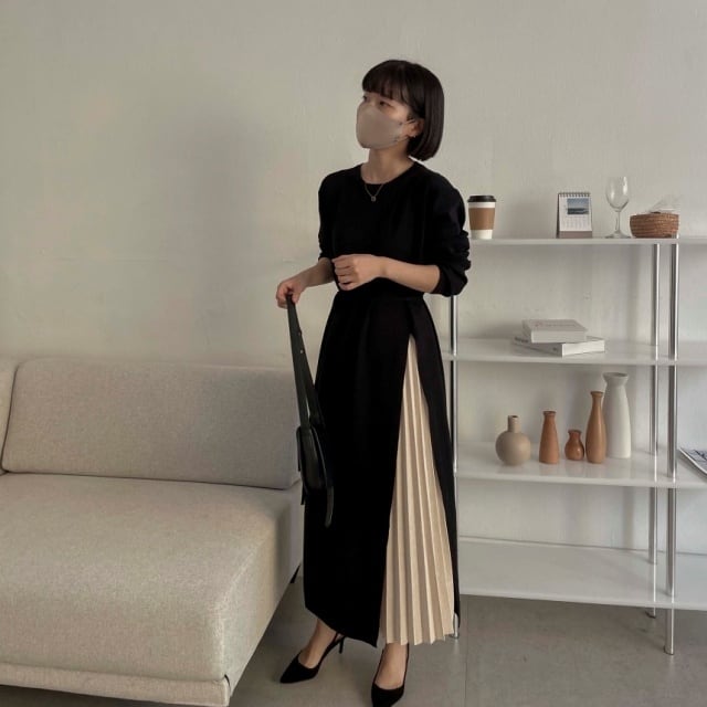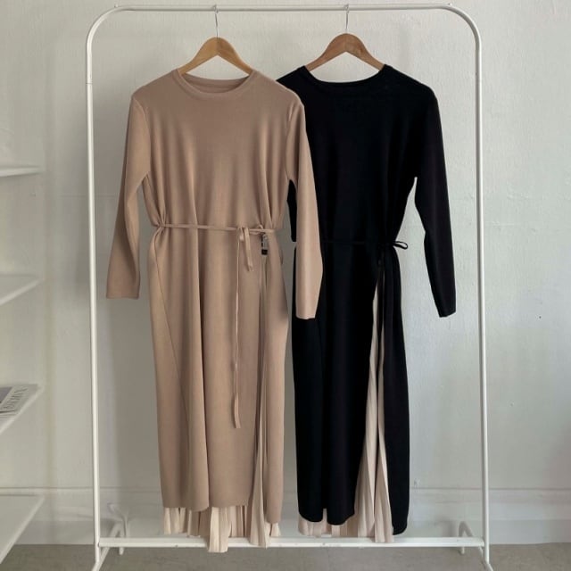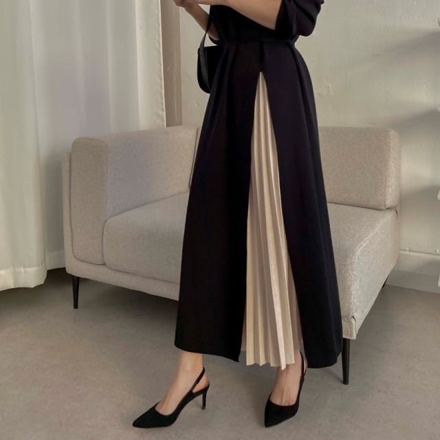 【予約販売】ワンピース レディース レイヤード 重ね着風 プリーツ ニット 長袖 フレア ブラック ベージュ ロングワンピース フェミニン 結婚式 ドレス 二次会 こなれ感 ワンピ 大人可愛い シンプル エレガント おしゃれ 韓国 旅行 トレンド フリー
