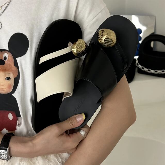 【予約販売】サンダル レディース ブラック オフホワイト ぺたんこ フラット 指輪 レザー カジュアル スポーティー ビーチサンダル 靴 お洒落 ストリート 旅行 韓国 22.5cm/23cm/23.5cm/24cm/24.5cm/25cm