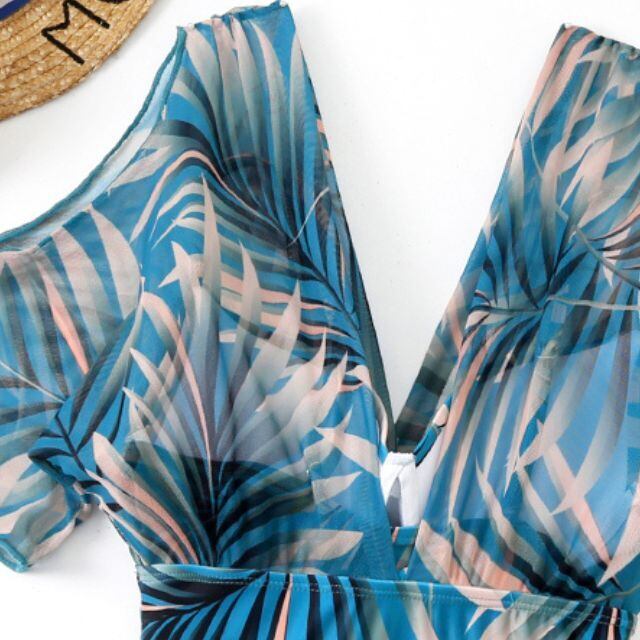 水着 レディース ワンピース 体型カバー 夏 リーフ柄 ボタニカル柄 総柄 二の腕 フレア ビーチ プール ブルー 大きいサイズ M/L/XL/2XL/3XL