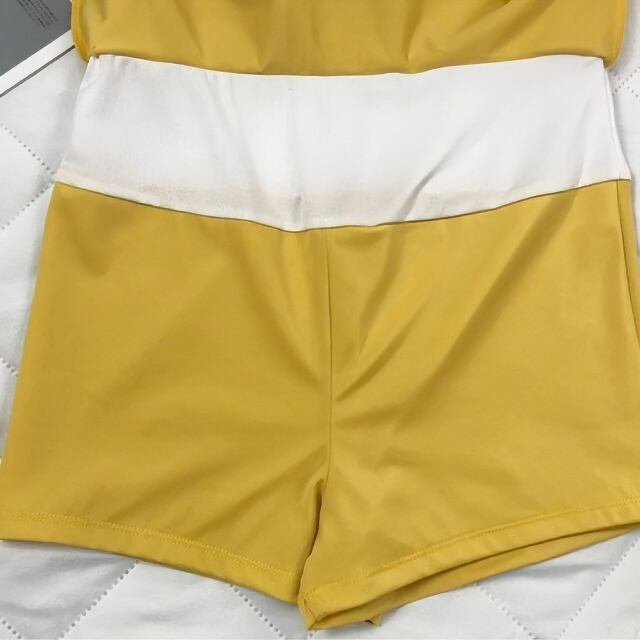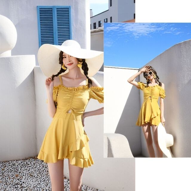 水着 レディース ワンピース 体型カバー 夏 シンプル フリル アシンメトリー 無地 フレア ビーチ プール イエロー ブラック ビーチファッション S/M/L/XL