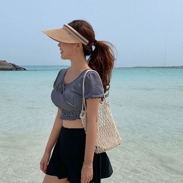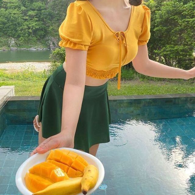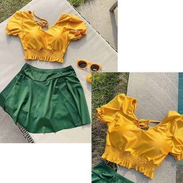 水着 レディース 3点セット タンキニ パフスリーブ スカート 可愛い フェミニン ガーリー ビーチ プール ブラック イエロー ブルー グリーン M/L/XL