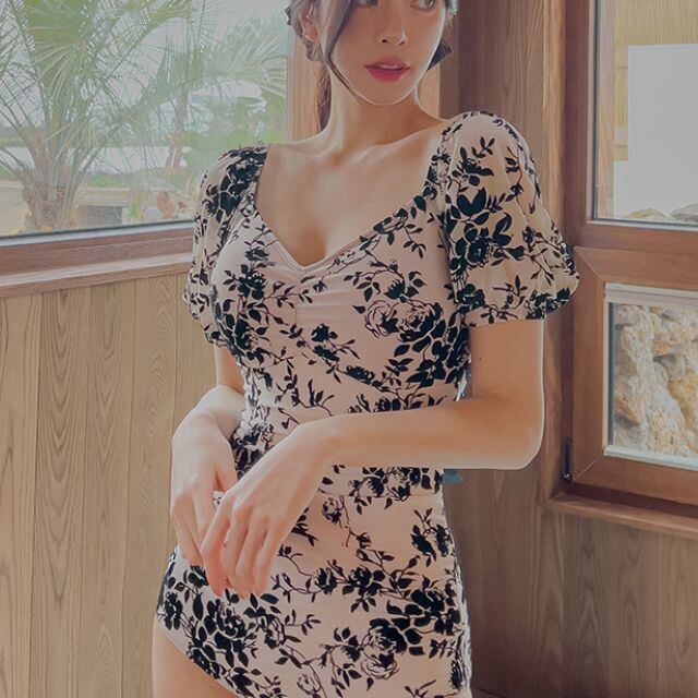 水着 レディース ワンピース 花柄 パフスリーブ フェミニン 大人っぽい 露出控えめ 夏 ビーチ プール バカンス ブラック ホワイト M/L/XL