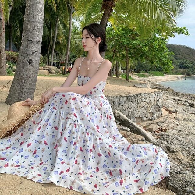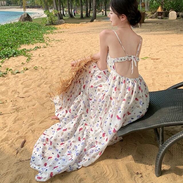 【予約販売】ワンピース ロング丈 レディース ホワイト 花柄 フレア ボリューム キャミソール 総柄 背中見せ ロングワンピース こなれ感 ワンピ 大人可愛い エレガント おしゃれ 韓国 旅行 バカンス 春 夏 トレンド S/M/L/XL