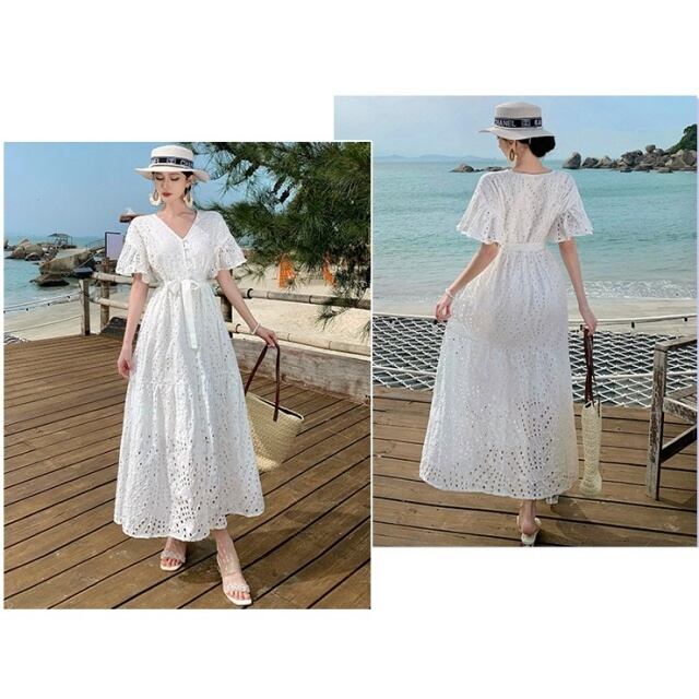 【予約販売】ワンピース ロング丈 レディース レース ホワイト 白 半袖 Vネック ウエストマーク マキシ丈 フレア ボリューム こなれ感 ワンピ 大人可愛い エレガント 韓国 旅行 春 夏 トレンド S/M/L/XL