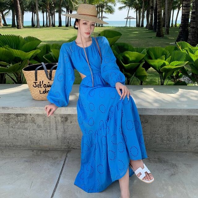 【予約販売】ワンピース ロング丈 レディース ブルー 青 ターコイズ 無地 マキシ丈 フレア 背中見せ 長袖 こなれ感 ワンピ 大人可愛い エレガント 韓国 旅行 バカンス 春 夏 トレンド S/M/L/XL