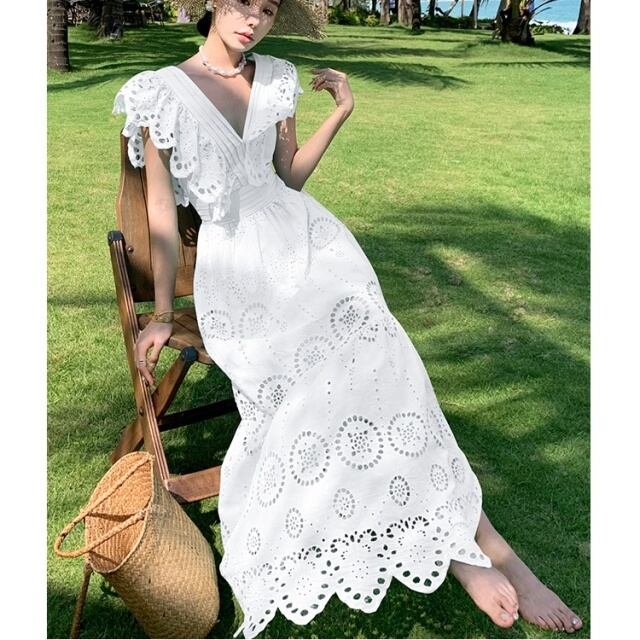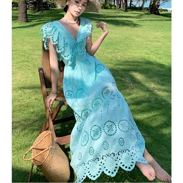 【予約販売】ワンピース ロング丈 レディース レース ホワイト 白 グリーン ミント 半袖 Vネック ウエストマーク マキシ丈 フレア ボリューム こなれ感 ワンピ 大人可愛い エレガント 韓国 旅行 春 夏 トレンド S/M/L/XL
