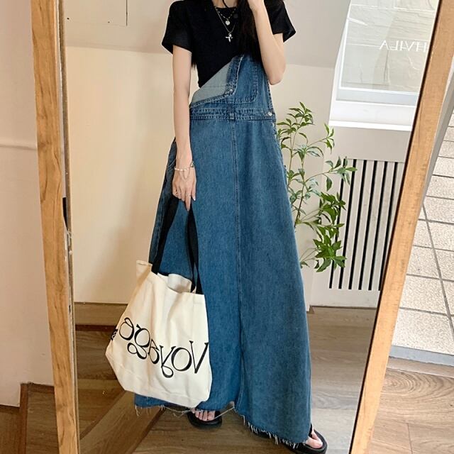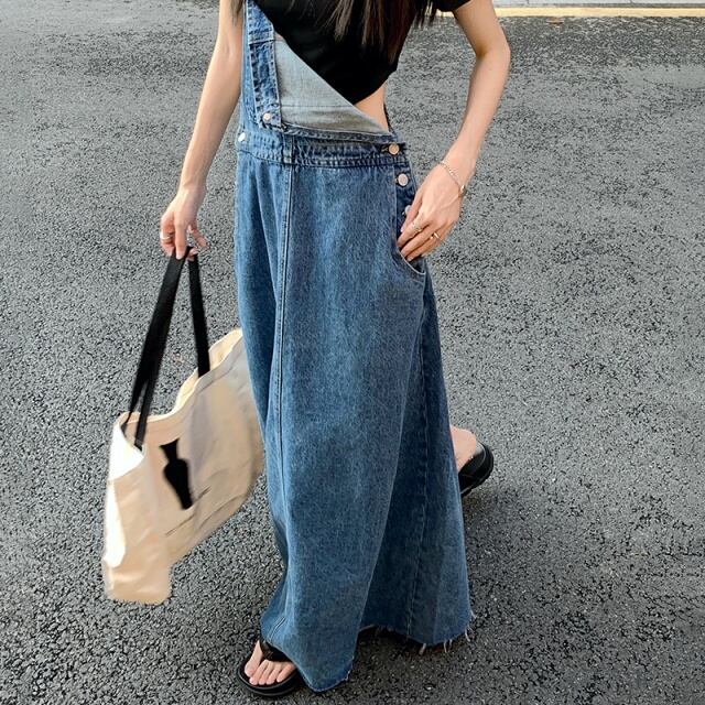 【予約販売】ワンピース サロペット デニム オーバーオール ロング丈 レディース 無地 ブルー マキシ丈 フレア シンプル こなれ感 ワンピ 大人可愛い エレガント 韓国 旅行 バカンス 春 夏 トレンド S/M/L