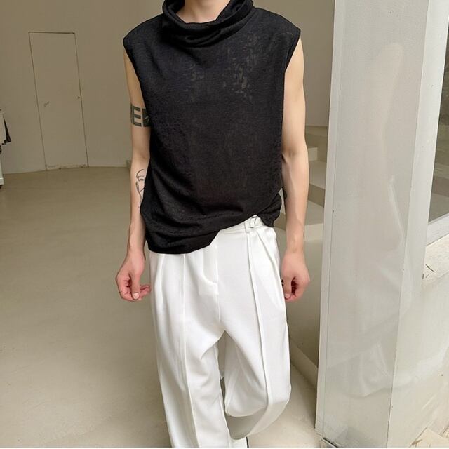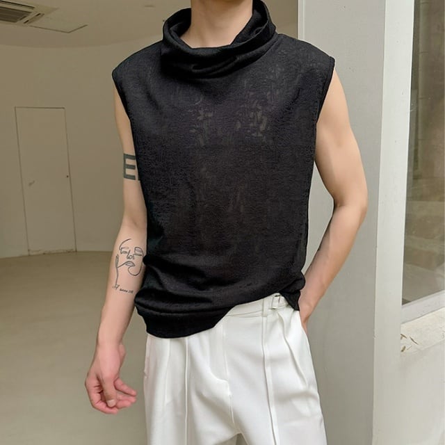 【予約販売】トップス ノースリーブ ハイネック メンズ レース ホワイト ブラック メッシュ 透け感 無地 こなれ感 カジュアル シンプル モード お洒落 韓国 トレンド 春 夏 M/L/XL