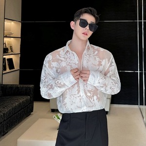 【予約販売】シャツ 長袖 トップス メンズ シアー 花柄 透け感 ブラック ホワイト 黒 白 デザインシャツ こなれ感 カジュアル シンプル モード お洒落 こなれ感 韓国 トレンド 春 夏 秋 M/L/XL
