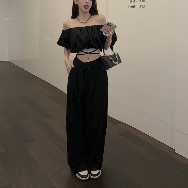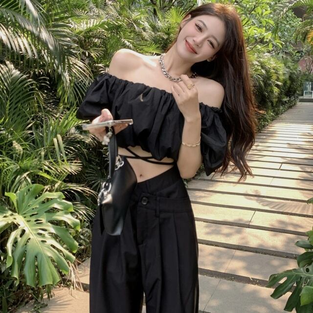 【予約販売】 トップス オフショルダー 無地 シンプル ショート丈 クロップド 編み上げ レディース ブラック ホワイト 大人可愛い フェミニン エレガント おしゃれ 韓国 旅行 上品 春 夏 トレンド S/M