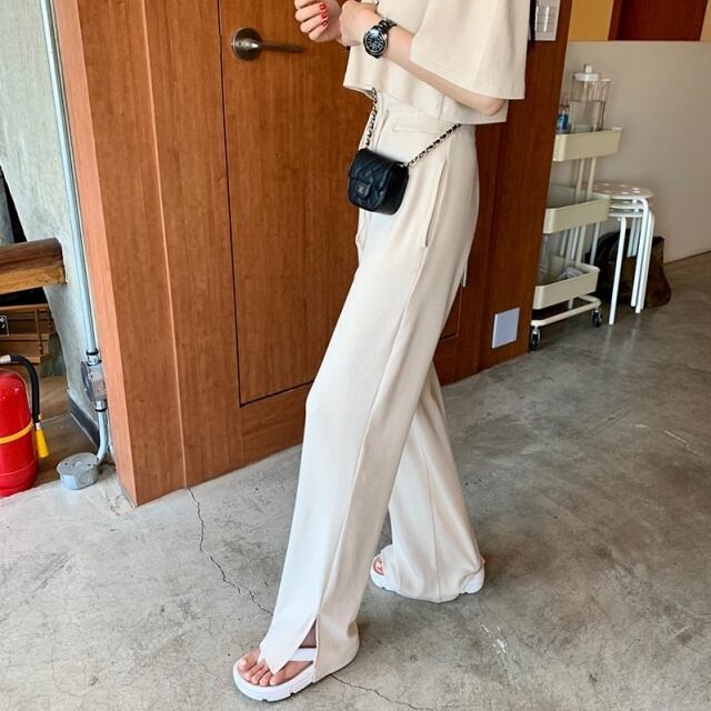 【予約販売】セットアップ レディース 無地 ベージュ ブラック 外スリット ワイドパンツ ハイウエスト ショート丈 Tシャツ 半袖 美ライン 体型カバー こなれ感 大人可愛い 楽ちん 旅行 韓国 春 夏 秋 トレンド フリー