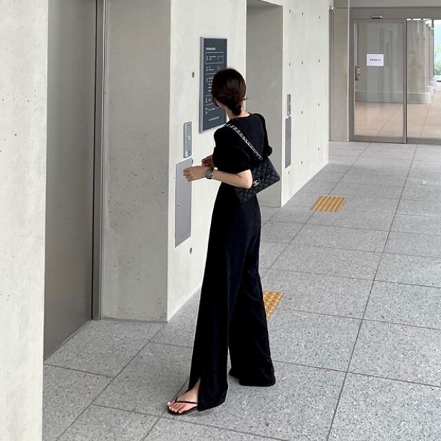 【予約販売】セットアップ レディース 上下2点セット パフスリーブ 無地 ベージュ ブラック スリット ワイドパンツ ハイウエスト ショート丈 半袖 美ライン 体型カバー こなれ感 大人可愛い 楽ちん 旅行 韓国 春 夏 秋 トレンド フリー