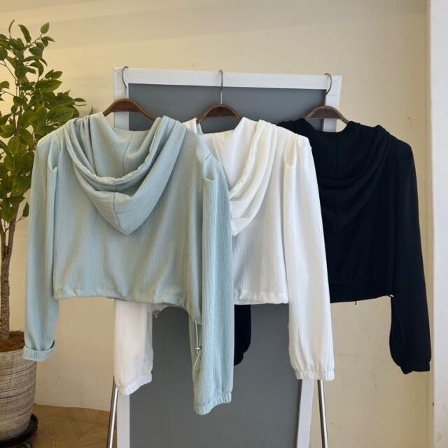 ボリューム袖が可愛いショート丈パーカーと