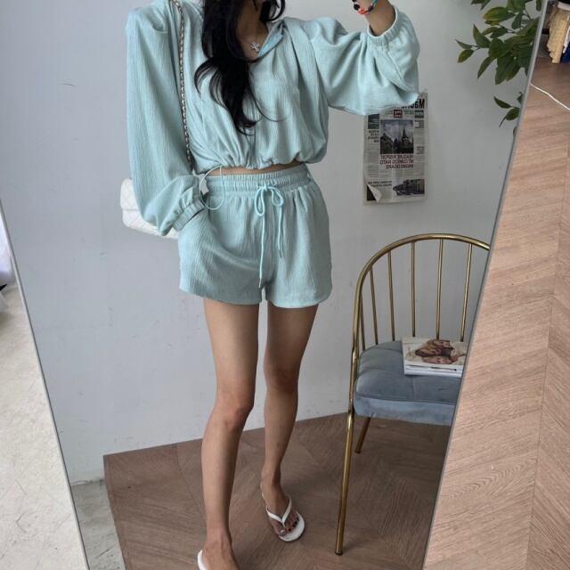 【予約販売】セットアップ シャツ ショートパンツ ハイウエスト パーカー 上下 レディース 長袖 ボリューム袖 ホワイト ブラック ブルー 体型カバー こなれ感 大人可愛い シンプル おしゃれ 韓国 旅行 バカンス 春 夏 秋 トレンド フリー