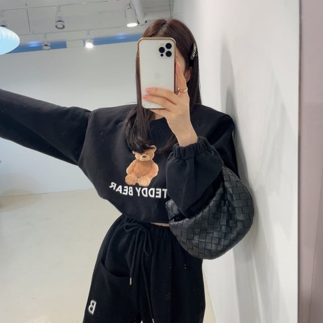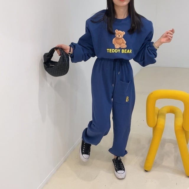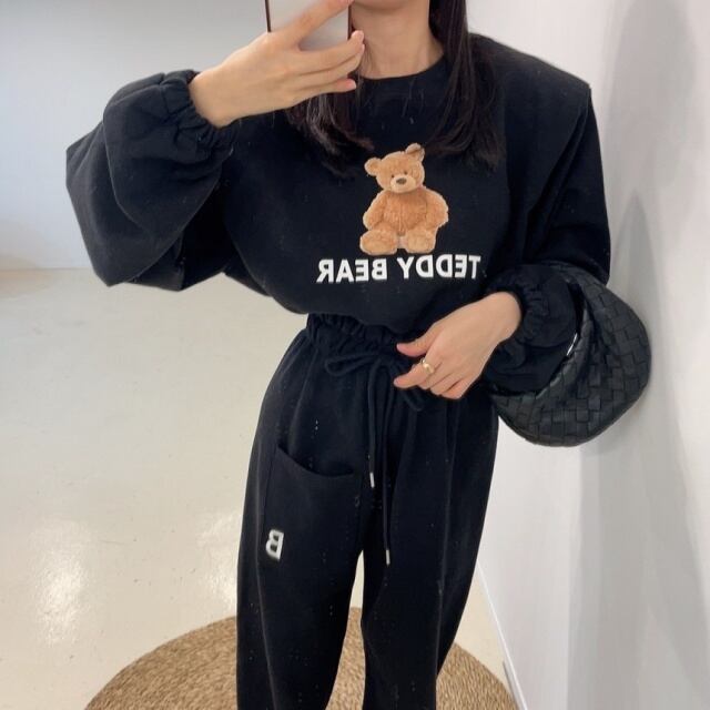 【予約販売】セットアップ レディース スウェット 長袖 クマ柄 ベアー ベージュ ブラック グレー ブルー ハイウエスト ショート丈 美ライン 体型カバー こなれ感 大人可愛い 楽ちん 旅行 韓国 春 夏 秋 トレンド フリー