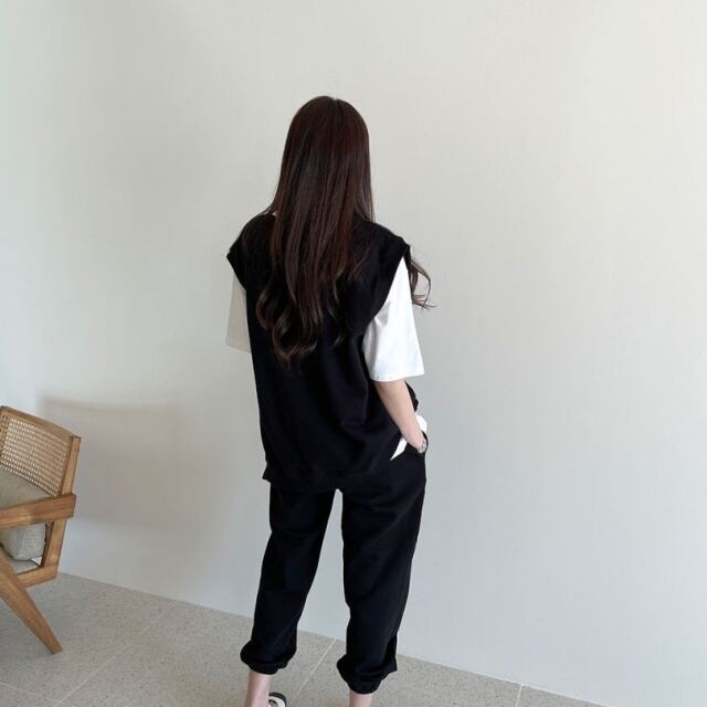 【予約販売】セットアップ レディース スウェット ベスト ブラック グレー レイヤード オーバーサイズ 美ライン 体型カバー こなれ感 大人可愛い 楽ちん 旅行 韓国 春 夏 秋 トレンド フリー