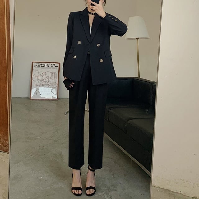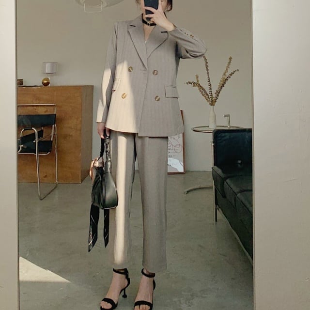 【予約販売】セットアップ ジャケット パンツ スーツ グレー ブラック ベージュ 上下 レディース 前ボタン オフィス カジュアル 体型カバー こなれ感 大人可愛い シンプル おしゃれ 韓国 OL ビジネス 春 夏 秋 冬 トレンド S/M/L/XL