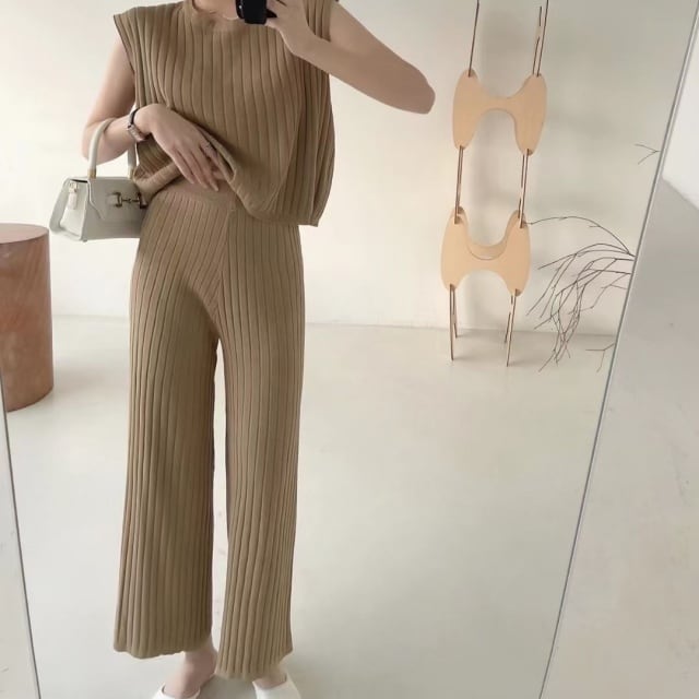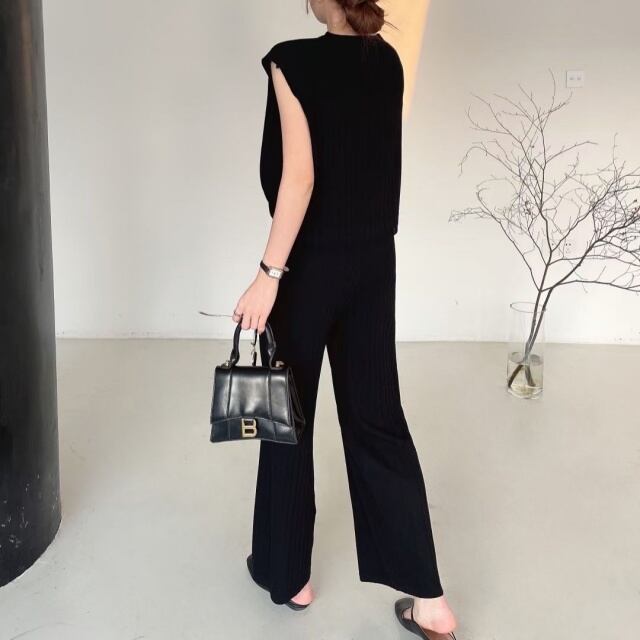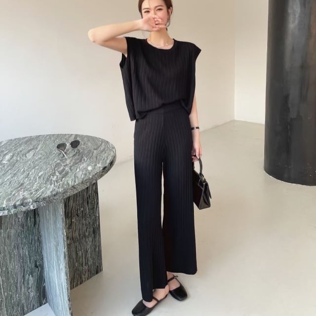 【予約販売】セットアップ レディース ブラック アイボリー キャメル ノースリーブ リブ 無地 ウエストゴム ワイドパンツ ハイウエスト ショート丈 半袖 美ライン 体型カバー こなれ感 大人可愛い 楽ちん 旅行 韓国 春 夏 秋 トレンド フリー