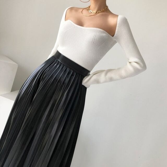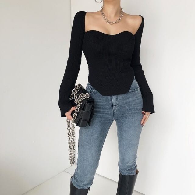 鎖骨を見せて華奢感と女性らしさを引き立ててくれる1着。