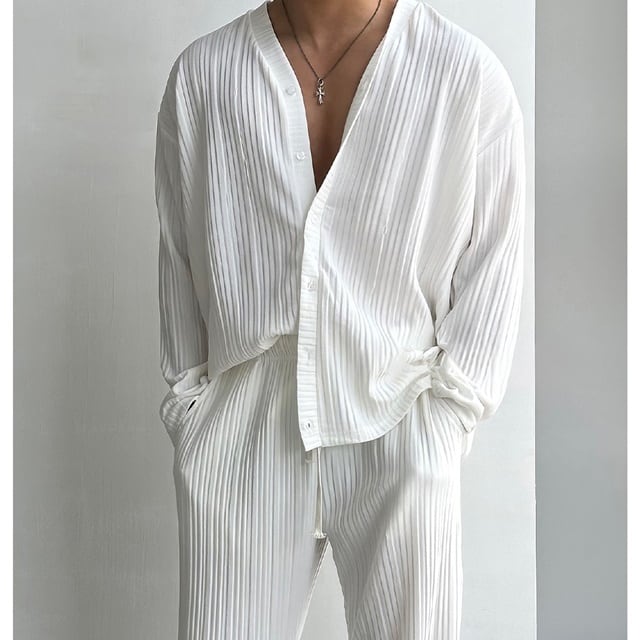 【予約販売】メンズ セットアップ 上下 Vネック パンツ 長袖 カーディガン 無地 ドレープ ブラック ホワイトきれいめ カジュアル 春夏 韓国 トレンド こなれ感 M/L/XL