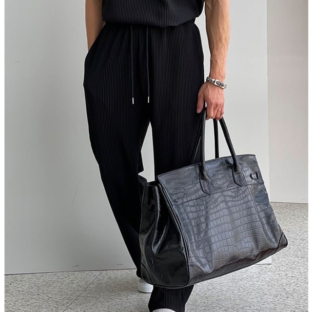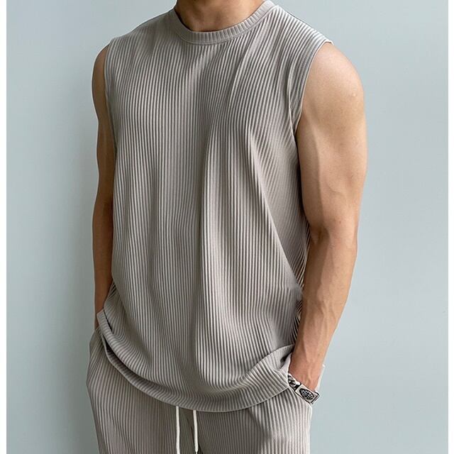 【予約販売】メンズ セットアップ 上下 ノースリーブ タンクトップ パンツ リブ 無地 ドレープ ブラック ベージュ きれいめ カジュアル 春夏 韓国 トレンド こなれ感 M/L/XL