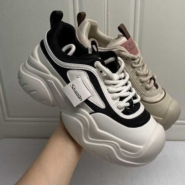 【予約販売】スニーカー 韓国 レディース ダッドシューズ ゴツ底 厚底 高身長 上げ底 靴 ブラック ベージュ デザイン お洒落 カジュアル ストリート ダンス 22.5cm/23cm/23.5cm/24cm/24.5cm