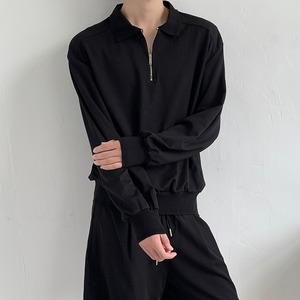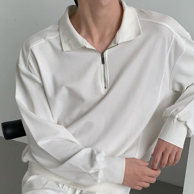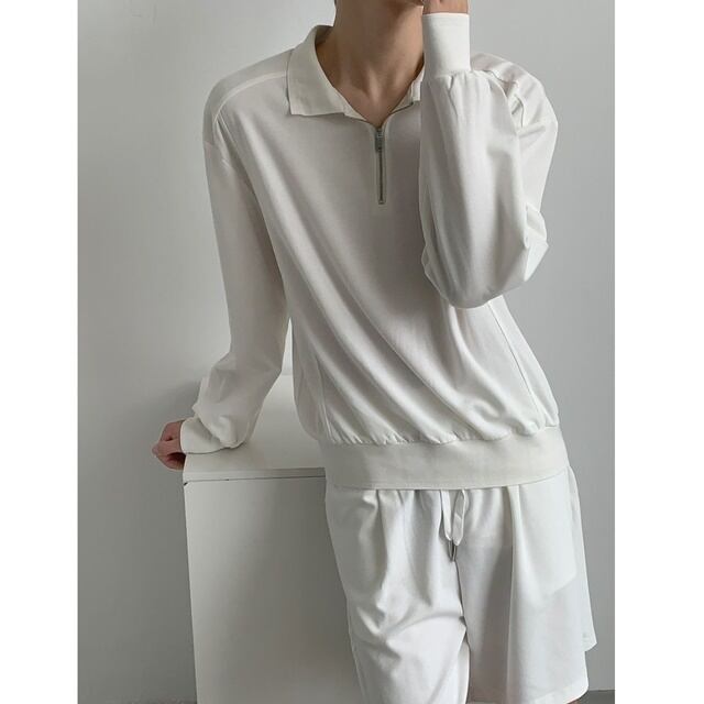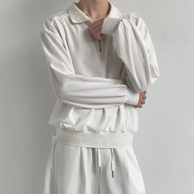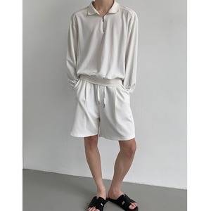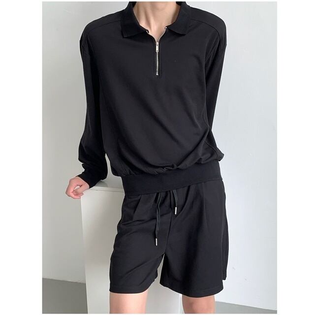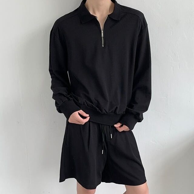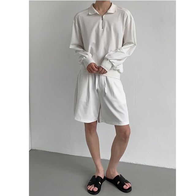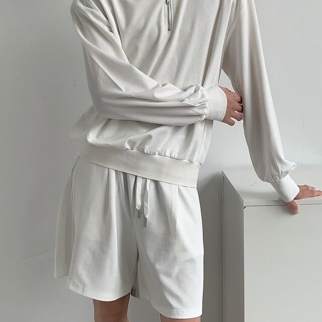 【予約販売】メンズ セットアップ 上下 ハーフパンツ 長袖 ジップアップ 無地 ブラック ホワイト ハイネック きれいめ カジュアル リラックス 部屋着 春 夏 秋 韓国 トレンド こなれ感 S/M/L