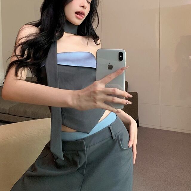 【予約販売】セットアップ レディース ベアトップ パンツ ブラウン グレー 上下 切り替え ハイウエスト カジュアル こなれ感 大人可愛い セクシー シンプル おしゃれ 韓国 春 夏 秋 トレンド S/M
