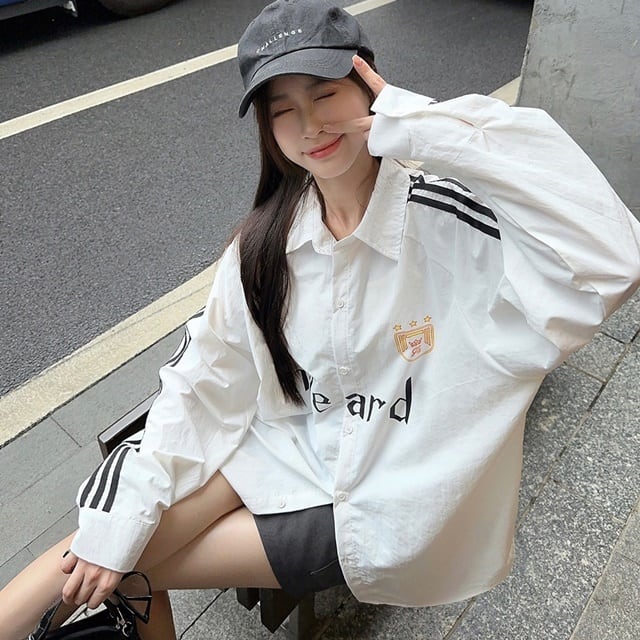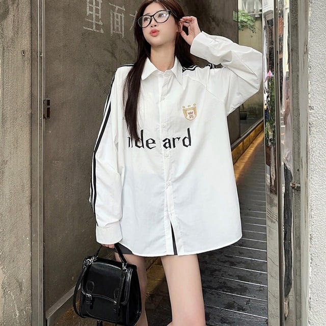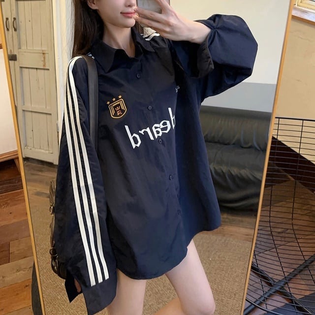 【予約販売】 シャツ オーバーサイズ ライン 長袖 ユニフォーム風 トップス レディース ビッグシルエット ネイビー ホワイト スポーティー こなれ感 体型カバー ゆったり 大人可愛い おしゃれ 韓国 OL 春 夏 秋 デート トレンド フリー