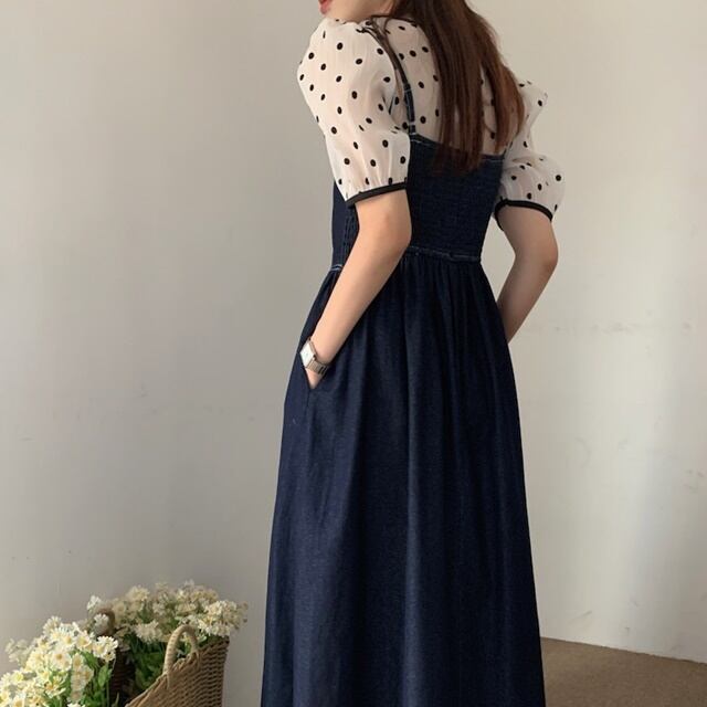 【予約販売】ワンピース ロング丈 レディース 無地 デニム ネイビー レディース ステッチ フレア シンプル こなれ感 ワンピ 大人可愛い エレガント 韓国 旅行 バカンス 春 夏 秋トレンド フリー