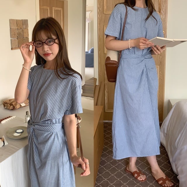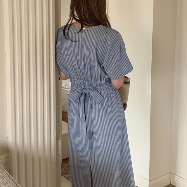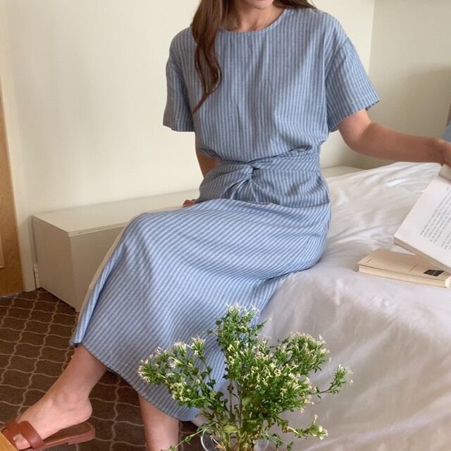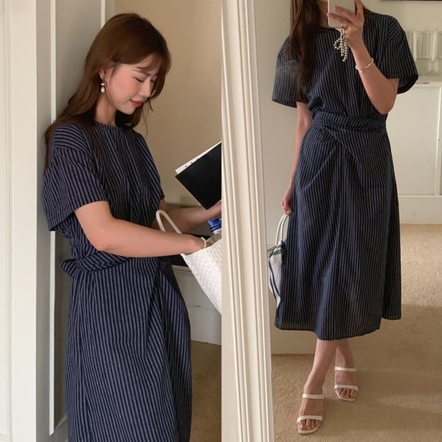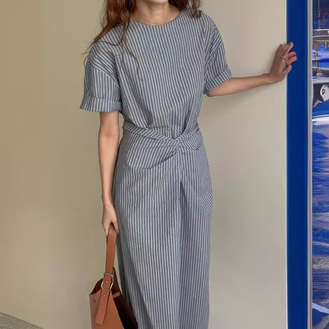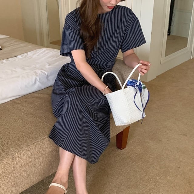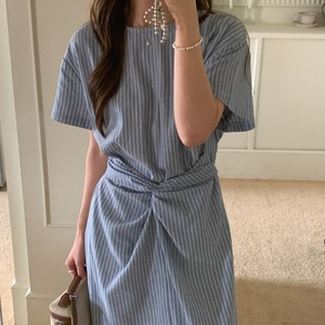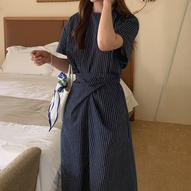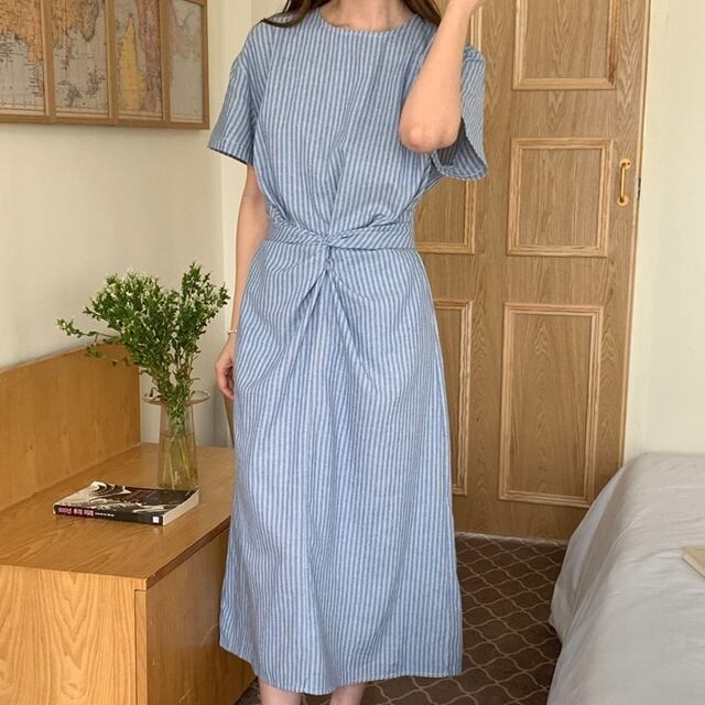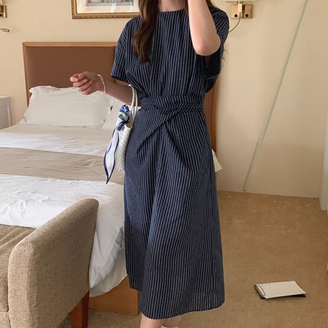 【予約販売】ワンピース レディース ミディアム丈 ストライプ柄 ウエストマーク 半袖 ネイビー ブルー カジュアル こなれ感 ワンピ 大人可愛い シンプル エレガント おしゃれ 韓国 旅行 バカンス 春 夏 秋 トレンド フリー