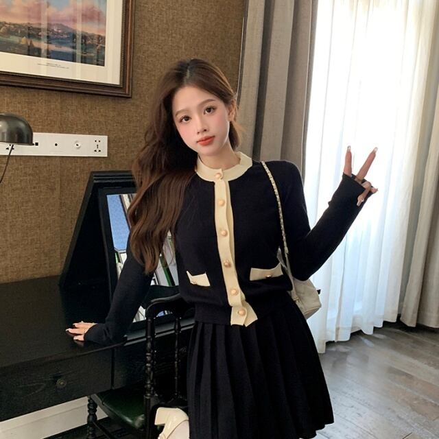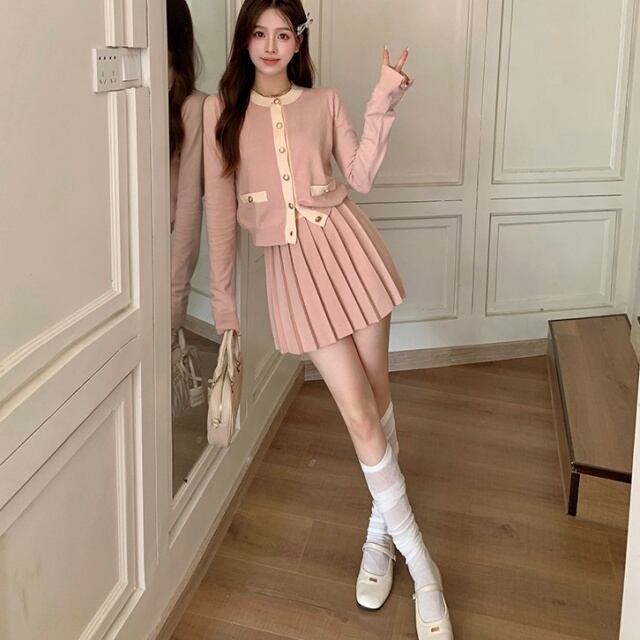 【予約販売】セットアップ ニット カーディガン プリーツスカート ミニ 金ボタン 上下 レディース 前ボタン オフィス カジュアル こなれ感 大人可愛い シンプル おしゃれ 韓国 秋 冬 トレンド S/M/L
