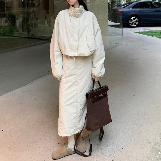 【予約販売】セットアップ レディース スカート ロング丈 長袖 ダウン アウター アイボリー 上下 カジュアル 体型カバー こなれ感 大人可愛い シンプル おしゃれ 韓国 通勤 旅行 冬 秋 トレンド S/M