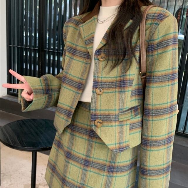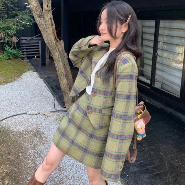 【予約販売】セットアップ ミニスカート ジャケット チェック柄 上下 レディース オフィス カジュアル こなれ感 大人可愛い シンプル おしゃれ 韓国 秋 冬 トレンド S/M/L