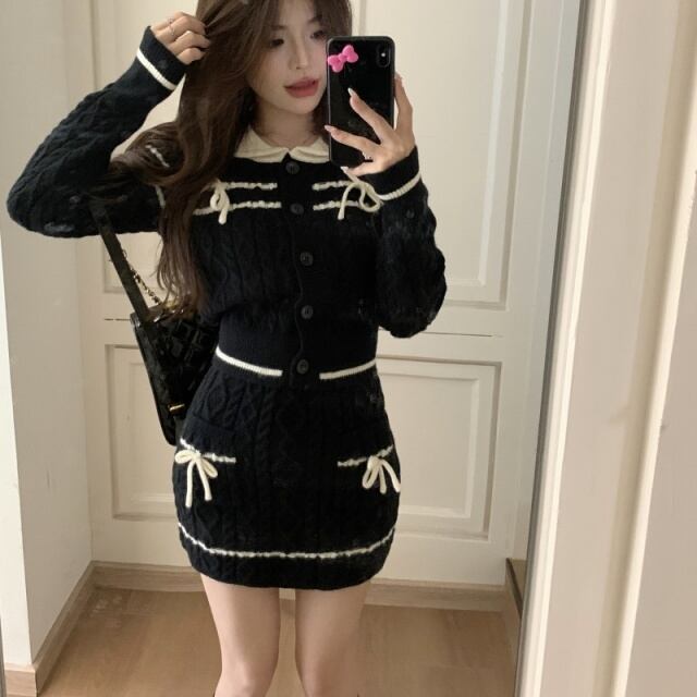 【予約販売】セットアップ レディース 無地 ニット リボン ミニスカート カーディガン ブラック バイカラー ゆったり こなれ感 大人可愛い きれいめ 楽ちん エレガント おしゃれ 旅行 韓国 秋冬トレンド フリー