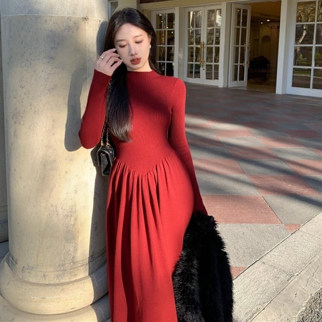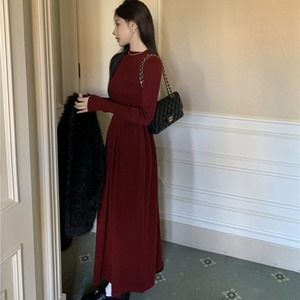 【予約販売】ワンピース ロング丈 レディース リブニット 無地 長袖 レディース ベージュ レッド コーヒー マキシ丈 フレア シンプル こなれ感 ワンピ 大人可愛い エレガント 韓国 秋 冬 トレンド フリー