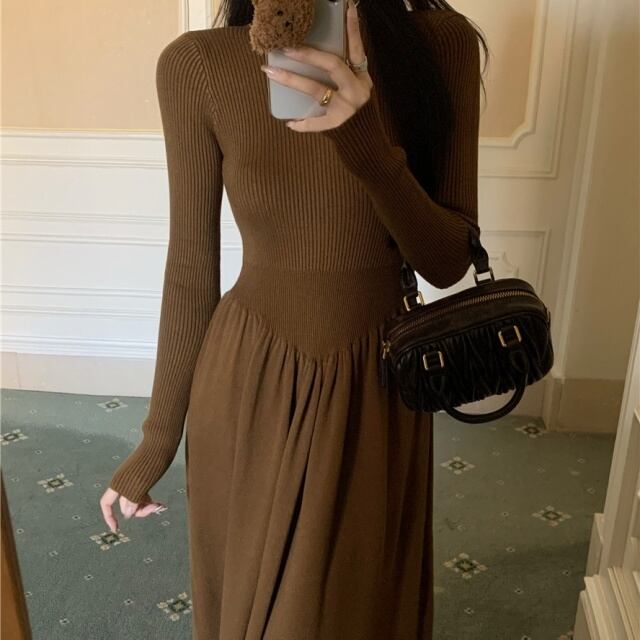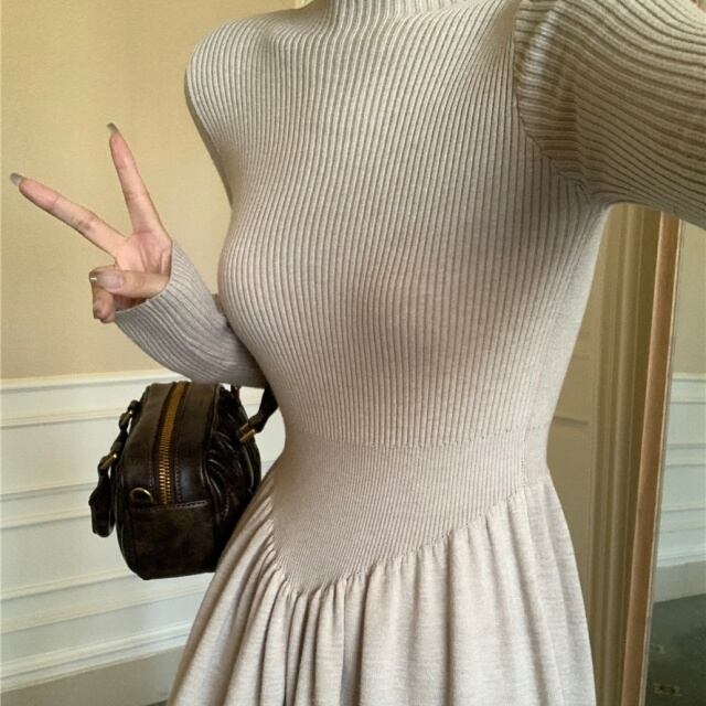 ワンピースの上部はシンプルなリブニットデザインで、