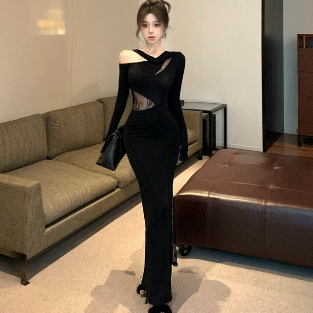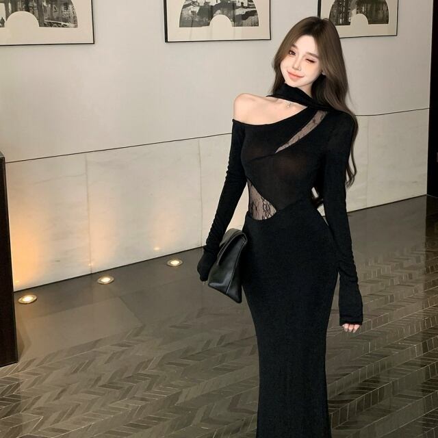 【予約販売】ワンピース レディース タイト レース 肌見せ ロングワンピース ブラック 黒 セクシー こなれ感 ワンピ 大人可愛い ドレス エレガント おしゃれ 韓国 トレンド S/M/L